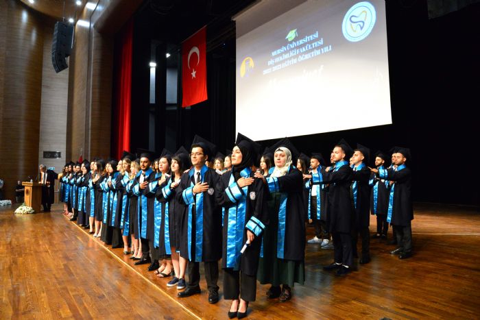 Fakülte ikincisi Şazer Kirazdere'ye temsili diploması ve plâketi Rektör Danışmanı Prof. Dr. İlker Fatih Kara; fakülte üçüncüsü Esra Dağ'a ise temsili diploması ve plâketi Diş Hekimliği Fakültesi Dekanı Prof. Dr. Fethi Atıl tarafından takdim edildi. Dereceye giren öğrencilere belge takdiminin ardından, diğer mezunlara da temsili diplomalarının verilmesinin sonrasında Tıp Fakültesi öğretim üyesi Prof. Dr. Nazım Gümüş tarafından mezunlara hekimlik andı okutuldu. Mezuniyet töreni, hekimlik andının okunmasının ardından mezunların keplerini havaya atması ve toplu fotoğraf çekiminin ardından sona erdi.