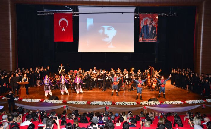 Daha sonrasında MEÜ Protokol Şube Müdürü Gülsüm Altıner Bozlak ve Basın ve Halkla İlişkiler Şube Müdürlüğü personeli Baha Sadık Akıner’in sunumunu üstlendiği konsere geçildi. Konserde MEÜ Devlet Konservatuvarı Orkestrası, Orta-Lise Korosu, Bale Anasanat Dalı ile Akdeniz Bölge ve Garnizon Komutanlığı Bandosu tarafından; Biz Atatürk’ün Gençleriyiz, Gençlik Marşı, Bülbülüm Altın Kafeste, Sabahın Seherinde, Drama Köprüsü, Hoş Gelişler Ola, Çalın Davulları, Bozkırın Sesi, Türkiye Senfonik Poem no:8, Manastırın Ortasında, Ah Bir Ataş Ver, Fikrimin İnce Gülü, Vals “Kelebek”, Harmandalı, Onuncu Yıl Marşı ve 100. Marşı eserleri icra edildi. İzleyenlerden büyük beğeni alan ve ayakta alkışlanan konser sonrasında, Rektörümüz Prof. Dr. Erol Yaşar tarafından Akdeniz Bölge ve Garnizon Komutan Vekili Deniz Albay Zafer Çelik, MEÜ Devlet Konservatuvarı Müdürü Prof. Dr. Toğroul Ganioğlu, Orkestra Şefi Öğr. Gör. Münif Akalın ile Akdeniz Bölge ve Garnizon Komutanlığı Bandosu Şefi Bnd. Tğm. Rafet Özdemir’e çiçek ve teşekkür belgesi takdiminde bulundu.
