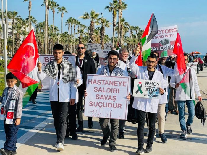 Mersin'de çeşitli hastanelerde görev yapan doktor, sağlık çalışanı ve tıp fakültesi öğrencileri, işgal rejiminin saldırıları nedeniyle Gazze'de yaşananlara dikkat çekmek amacıyla, giydikleri kanlı önlüklerle sessiz yürüyüş eylemi düzenledi. Mersin İdman Yurdu Meydanından, ellerinde Filistin bayrakları ile kanlı önlükler ve kanlı eldivenler giyerek Özgecan Aslan Meydanı'na kadar yürüdü. Burada, grup adına basın açıklamasını okuyan Mersin Üniversitesi tıp birinci sınıf öğrencisi Melih Hilmi Tekin, 7 Ekim'de başlayan saldırıların artık şiddetlenen çatışmalarla birlikte katliama dönüştüğünü söyledi.