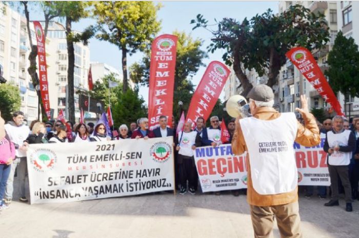 Mersin’de Emeklilikte Yaşa Takılanlar Derneği, 2021 Tüm Emekliler Sendikası ve Türkiye Emekliler Derneği emeklilerin yaşadığı geçim sıkıntısına dikkat çekmek için ortak basın açıklaması yaptı. Özgür Çocuk Parkı’nda gerçekleştirilen eylemde emekliler, “Sefalet ücretine hayır, insanca yaşamak istiyoruz”, “Mutfakta yangın var geçinemiyoruz” pankartları açtı. Sloganlar atarak, “Delik büyük yama küçük” tepkisini dile getiren emekliler seslerine kulak verilmesini istedi.