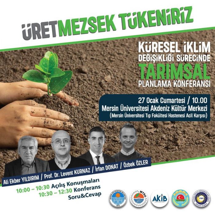 Mersin Büyükşehir Belediyesi, Mersin Ticaret ve Sanayi Odası (MTSO), Akdeniz İhracatçılar Birliği (AKİB), Türkiye Ziraat Odaları Birliği (TZOB) ve TMMOB Ziraat Mühendisleri Odası Mersin Şubesi işbirliğinde; ‘Üretmezsek Tükeniriz’ başlığıyla ‘Küresel İklim Değişikliği Sürecinde Tarımsal Planlama Konferansı’nın bu yıl 3.’sü yapılacak. Küresel ısınmadan en çok etkilenen iller arasında olan tarım kenti Mersin için alınacak önlemlerin ve yapılacak projelerin konuşulacağı konferansa; alanında uzman, birbirinden değerli konuşmacılar katılacak. Üretici ve mühendisi, alanında uzman konuklarla bir araya getirecek olan konferans; 27 Ocak Cumartesi günü saat 10.00’da Mersin Üniversitesi Akdeniz Kültür Merkezi’nde düzenlenecek.