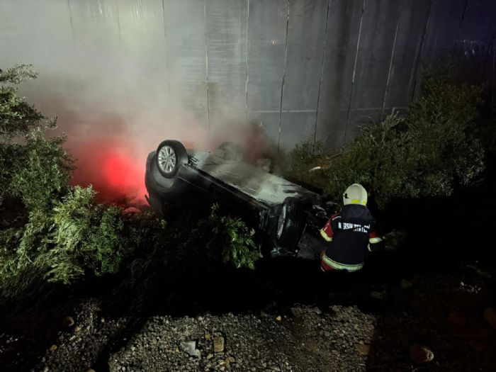 Mersin'de seraya çarpıp ters dönen elektrikli araçtaki batarya yangını itfaiye ekiplerince söndürülürken, sürücü hastaneye kaldırıldı.